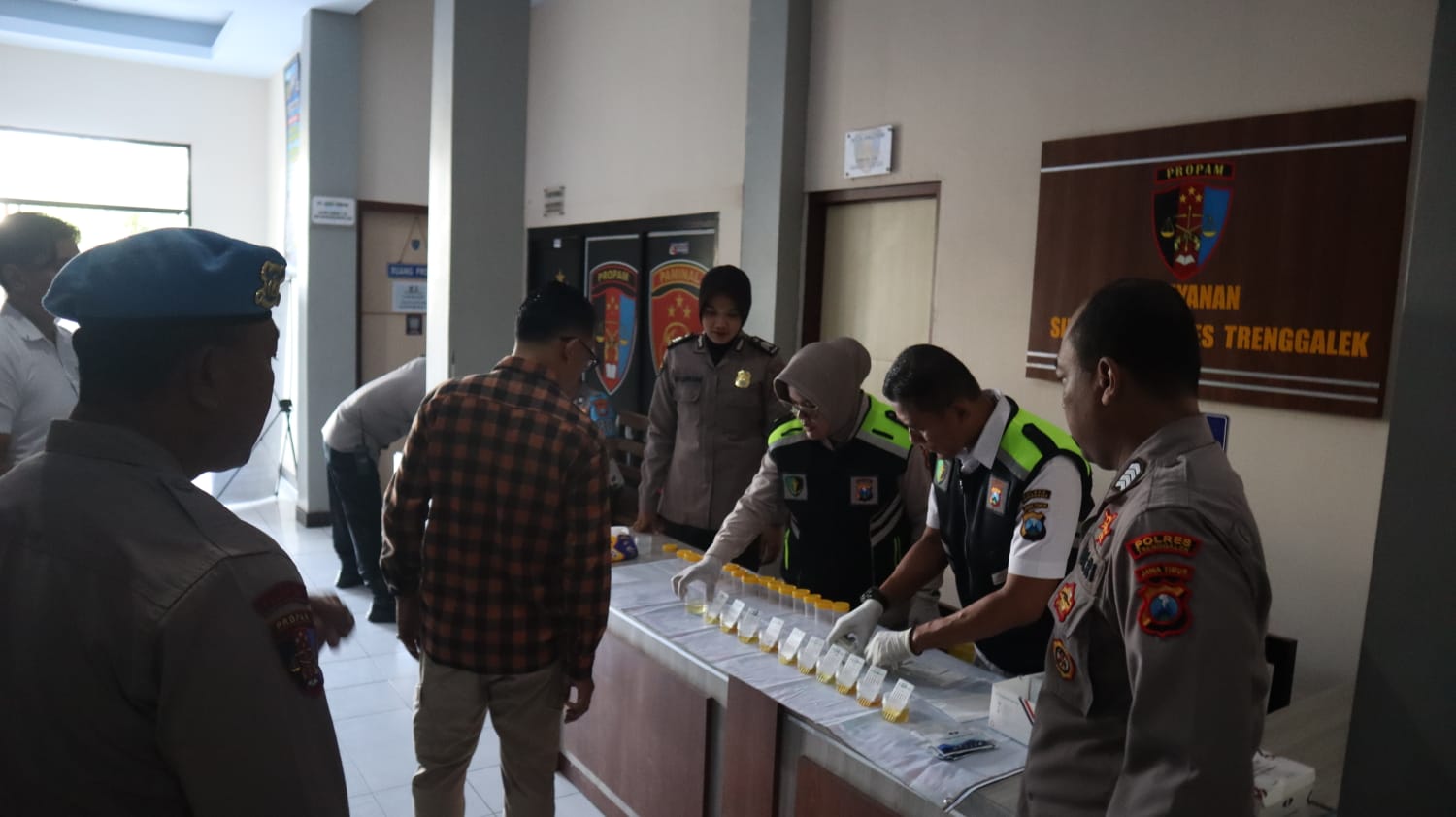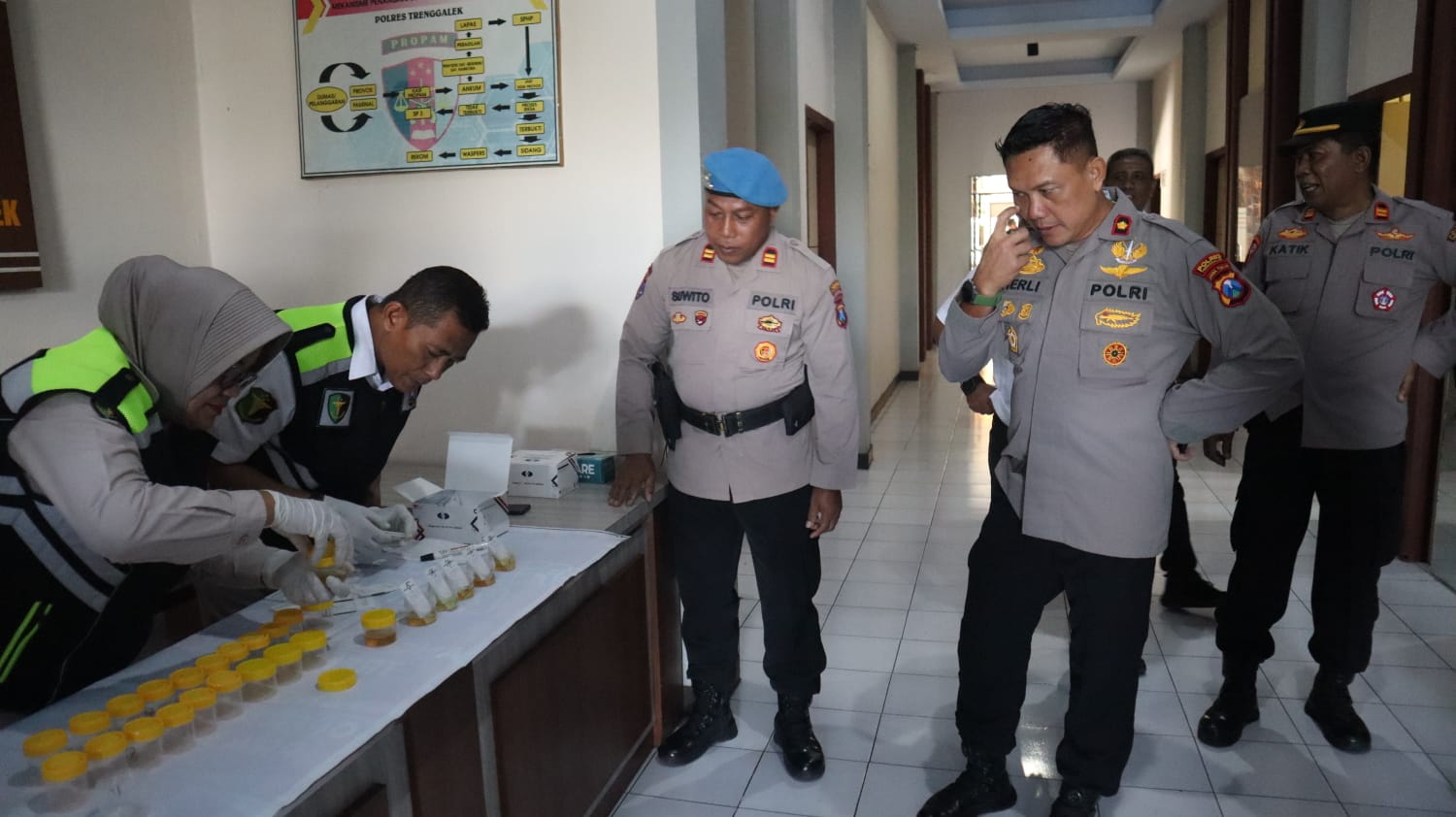 Selesai apel pagi, seluruh perwira diminta untuk merapat ke lorong gedung utama Mapolres tepatnya didepan ruang Sipropam. Setelah didata dan absensi, seluruh perwira diperintahkan untuk mengambil urine masing-masing ke tempat yang telah disediakan.