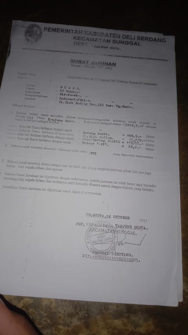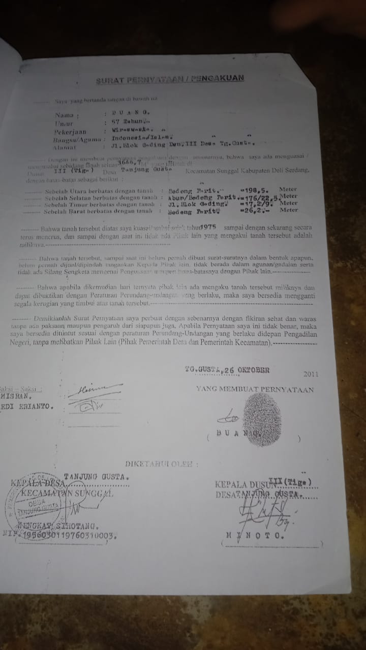 Oknum Kades Blok gading Tanjung Gusta BW diduga Kuat Membuat Surat Jaminan Sengketa atas Tanah milik Alm. Wagimin (Ayah dari Alm. Buang, Rosmawati dan saudara lainnya)