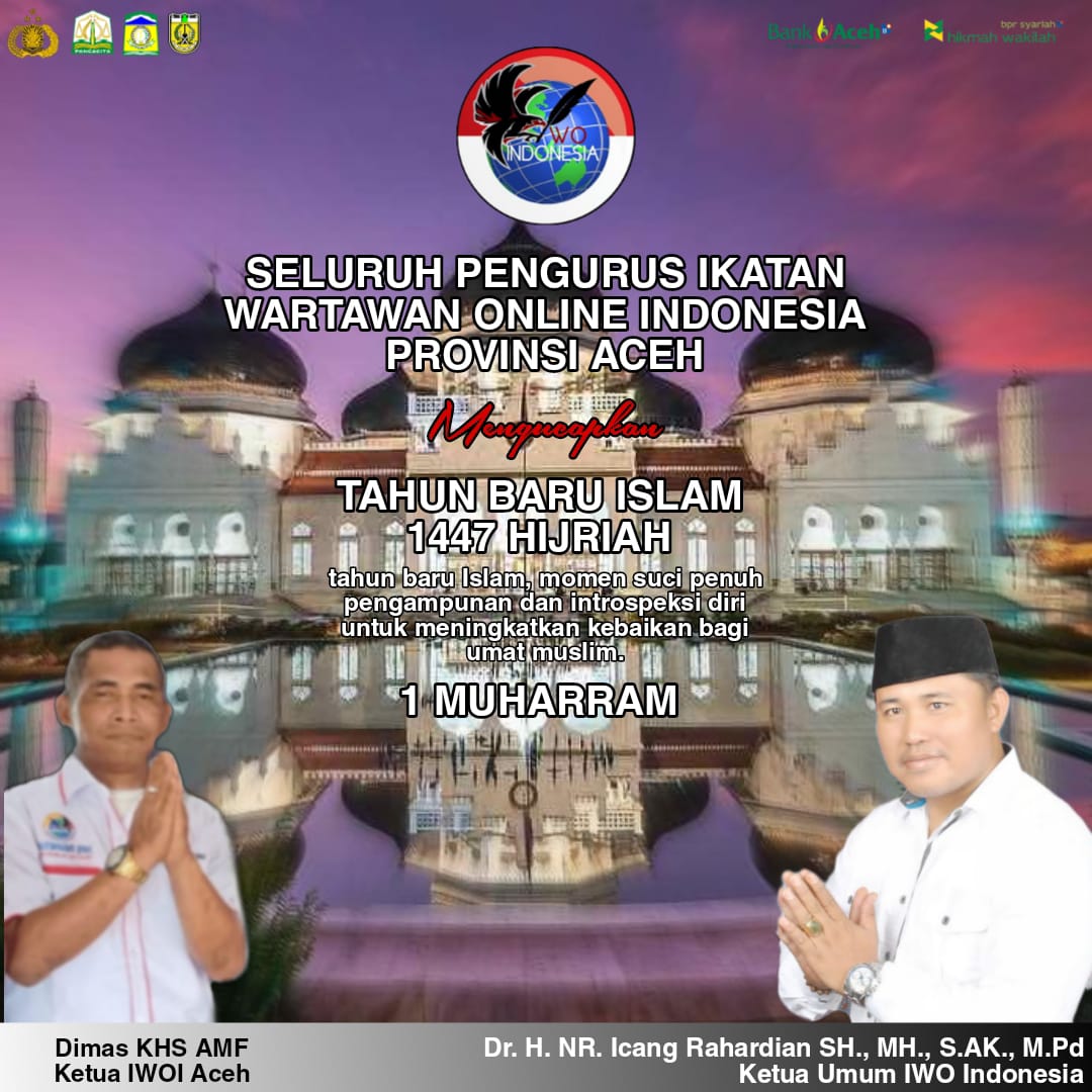 Seluruh jajaran pengurus Ikatan Wartawan Online Indonesia (IWO) Provinsi Aceh menyampaikan ucapan selamat Tahun Baru Islam 1 Muharram 1447 Hijriah kepada seluruh umat Muslim, khususnya di Tanah Rencong.