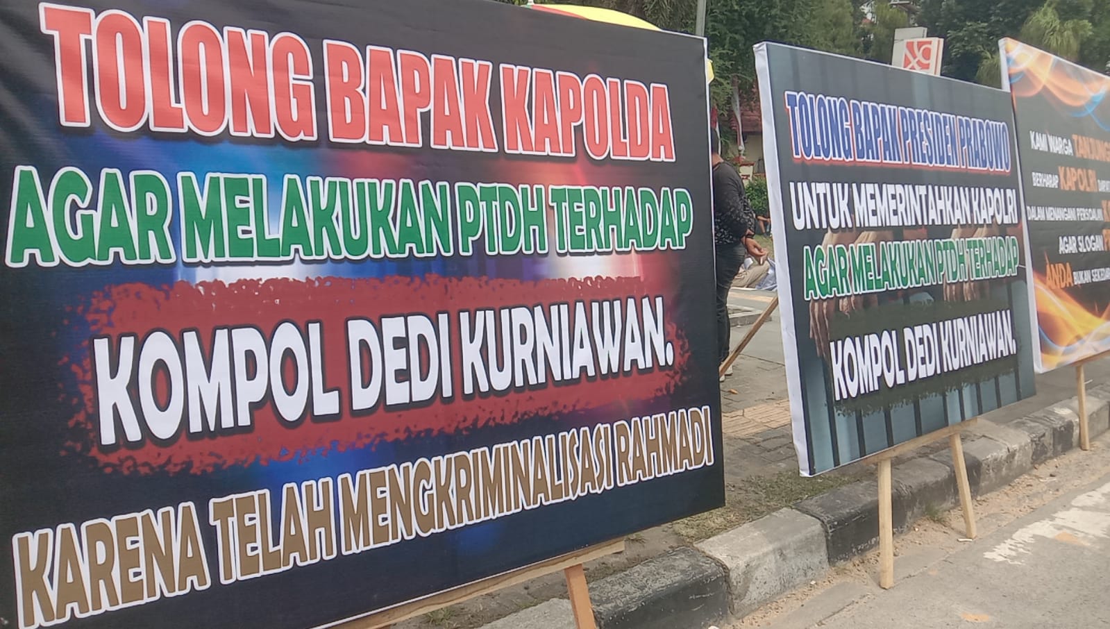 Tidak sampai di situ, spanduk yang menyerupai papan bunga bertuliskan kecaman dan harapan kepada Kapolri dan Presiden Prabowo untuk menindak bahkan memecat Kompol DK terpampang di dapan markas Polda Sumut.