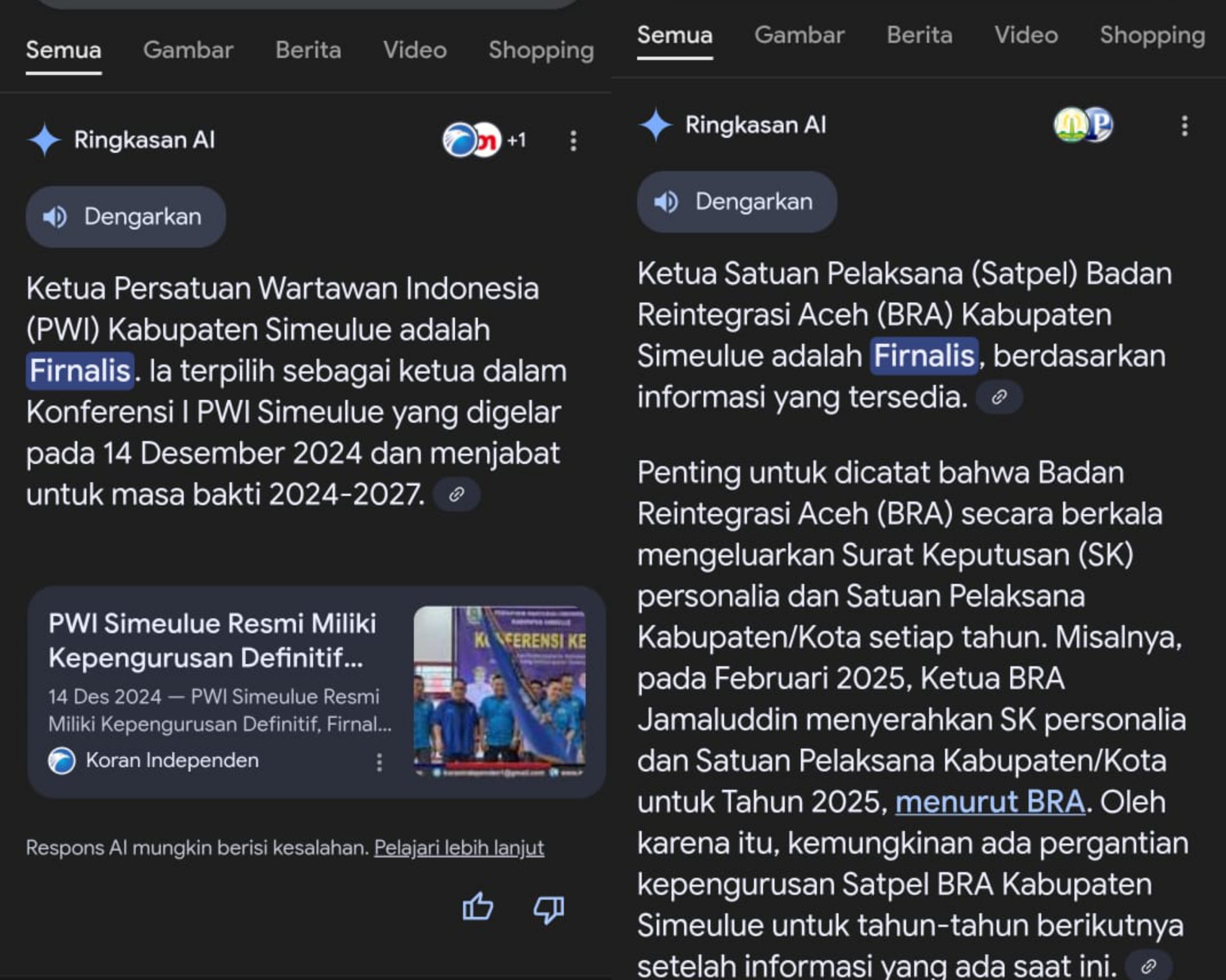 Praktik rangkap jabatan yang dilakukan oleh Ketua Persatuan Wartawan Indonesia (PWI) Kabupaten Simeulue, Firnalis, menuai sorotan tajam. Pasalnya, sejak tahun 2022 hingga saat ini, Firnalis diketahui menjabat sebagai Ketua Satuan Pelaksana (Satpel) Badan Reintegrasi Aceh (BRA) Simeulue, sebuah lembaga pelaksana program pemerintah Aceh yang dibiayai dari anggaran publik. Hal ini jelas menabrak prinsip-prinsip dasar kode etik jurnalistik, UU Pers No. 40 Tahun 1999, dan nilai-nilai independensi profesi wartawan.