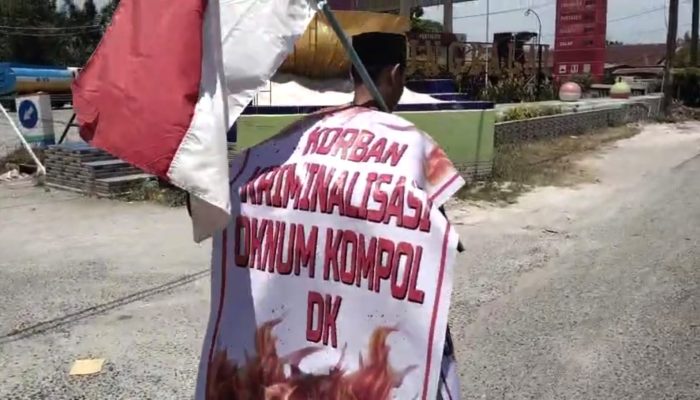 Di pundaknya tergantung ransel sederhana dan berkibar spanduk bertuliskan ‘Korban Kriminalisasi Oknum Kompol DK.’ Tujuannya tak main-main, Markas Besar Polri di Jakarta.