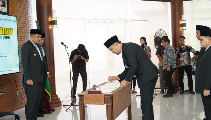 Sumut – Medan, Media SHI News// Perusahaan Umum Daerah (Perumda) Tirtanadi akhirnya memiliki Direktur Utama (Dirut) yang definitif setelah hampir satu tahun dijabat Pelaksana Tugas (Plt) Ewin Putra Adalah Gubernur Sumatera Utara Bobby Nasution melantik Ardian Surbakti menjadi Direktur Utama dan Salman Sihotang menjadi Direktur Administrasi dan Keuangan Perumda Tirtanadi di Kantor Gubernur Sumatera Utara (Sumut) Jumat (8/8/2025).