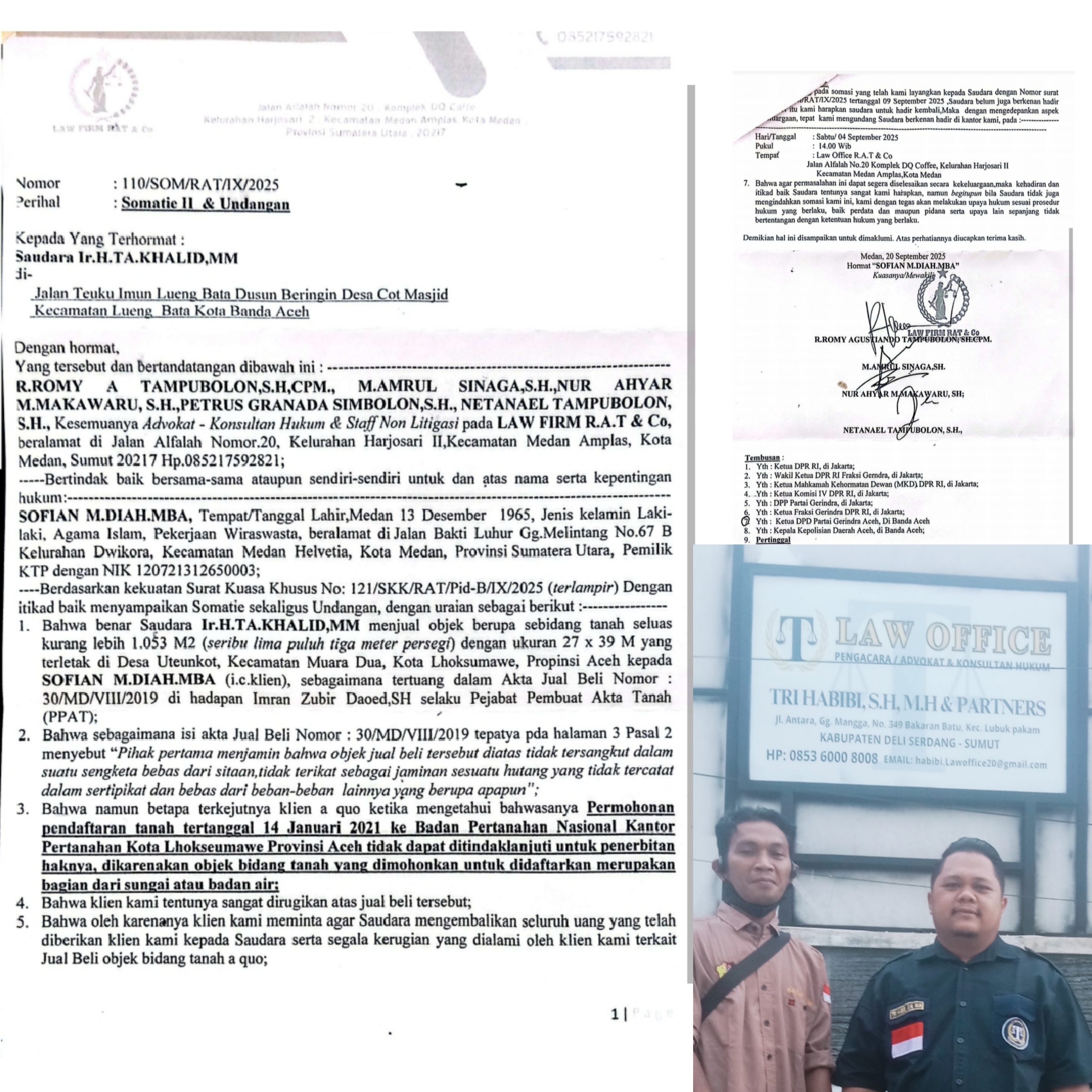 Menurut salah satu tokoh pakar hukum, Advokat Law Office Tri Habibi, SH MH menjelaskan kepada media, Jumat (26/09/2025), terkait somasi undangan dari kuasa hukum korban yaitu Sofyan M. Diah MBA.